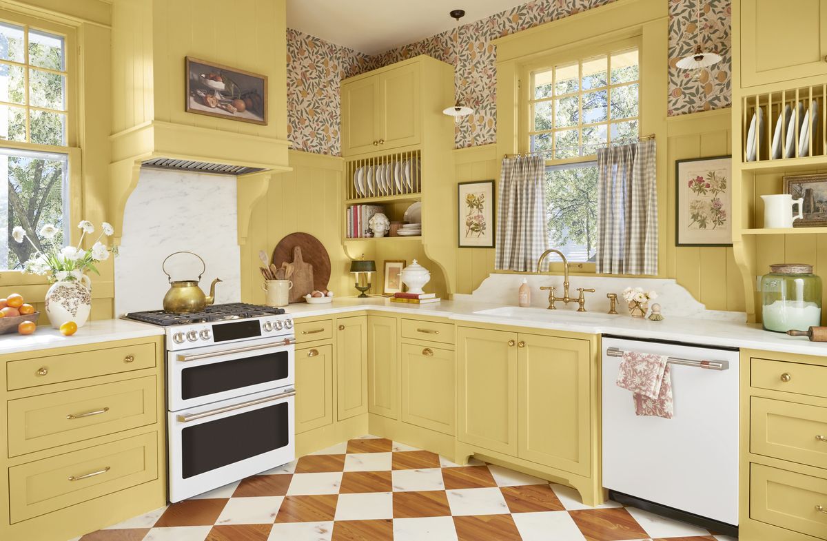 Becca McDowell’s galley kitchen features canary-yellow cabinets and quilt-like cement tiles, creating a charming and cohesive look.