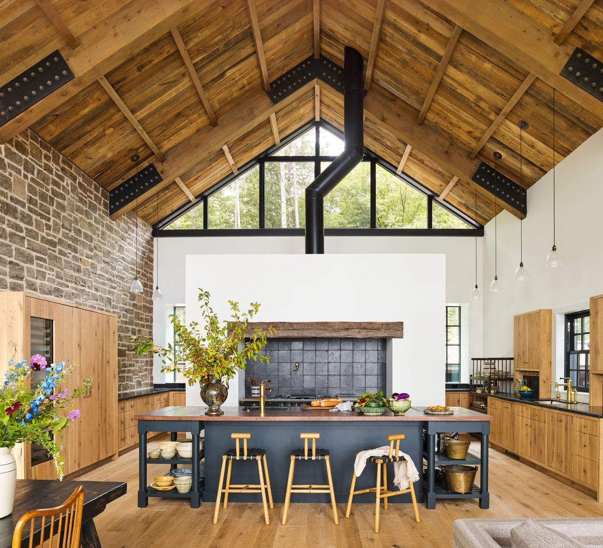 Mixing materials creates a timeless aesthetic in this Wisconsin kitchen, featuring a stone range hood, soapstone countertops, and smaller-scale white subway tile.