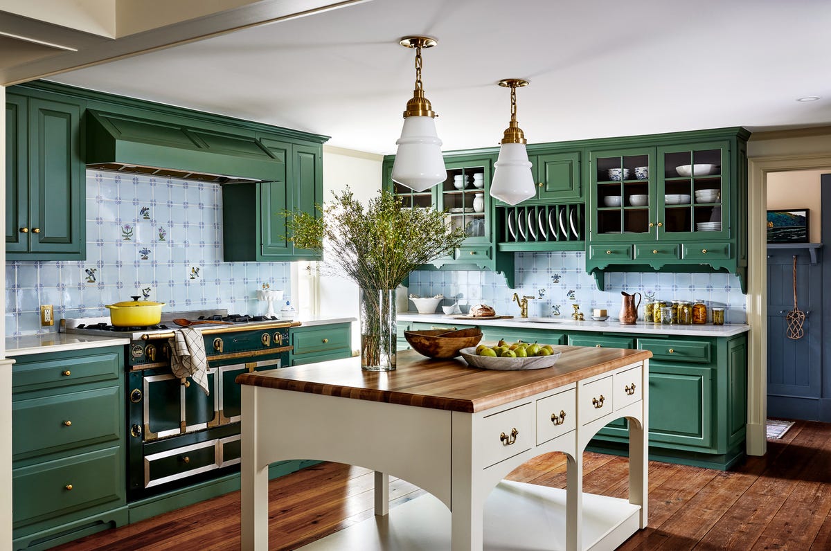 Amy Whyte transformed her Virginia galley kitchen with a stunning 27-drawer blue workbench, forest green range, and statement-making tile backsplash.