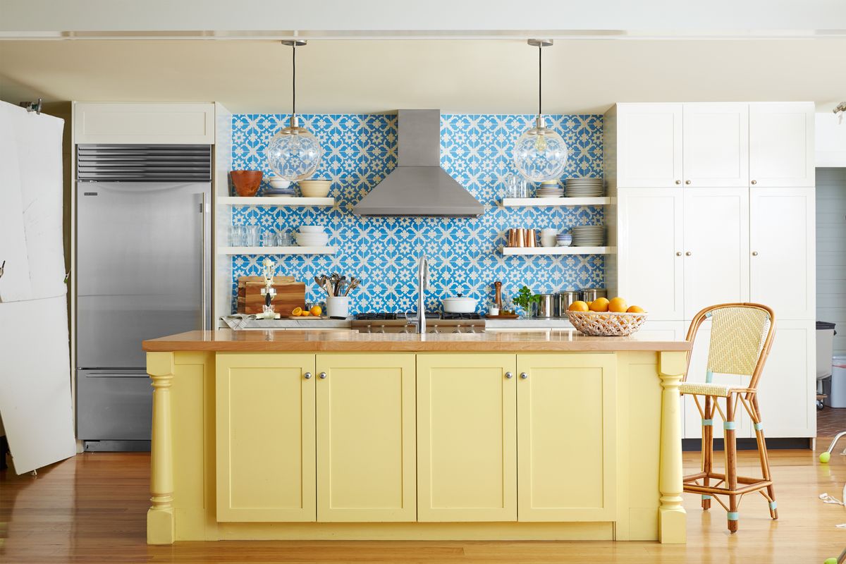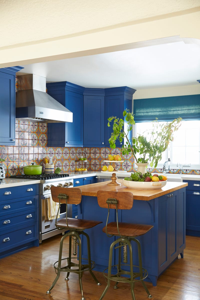 In this California kitchen by Reath Design, sunny Mexican tiles in a warm citrine shade balance the sapphire blue cabinetry, adding a bold and vibrant touch.
