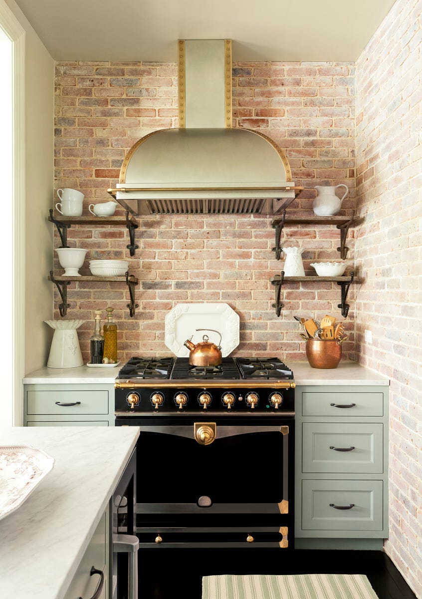 Brick walls provide texture and warmth in this compact kitchen, paired with soft sage green and brass detailing.