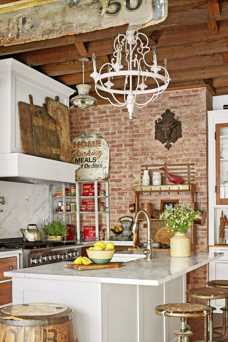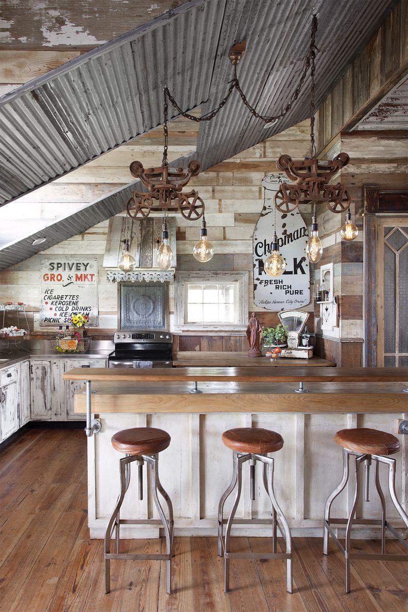 Amy Kleinwachter packed character into her Texas kitchen using reclaimed wood, antique signage, and a large-scale decorative tile above the stove.