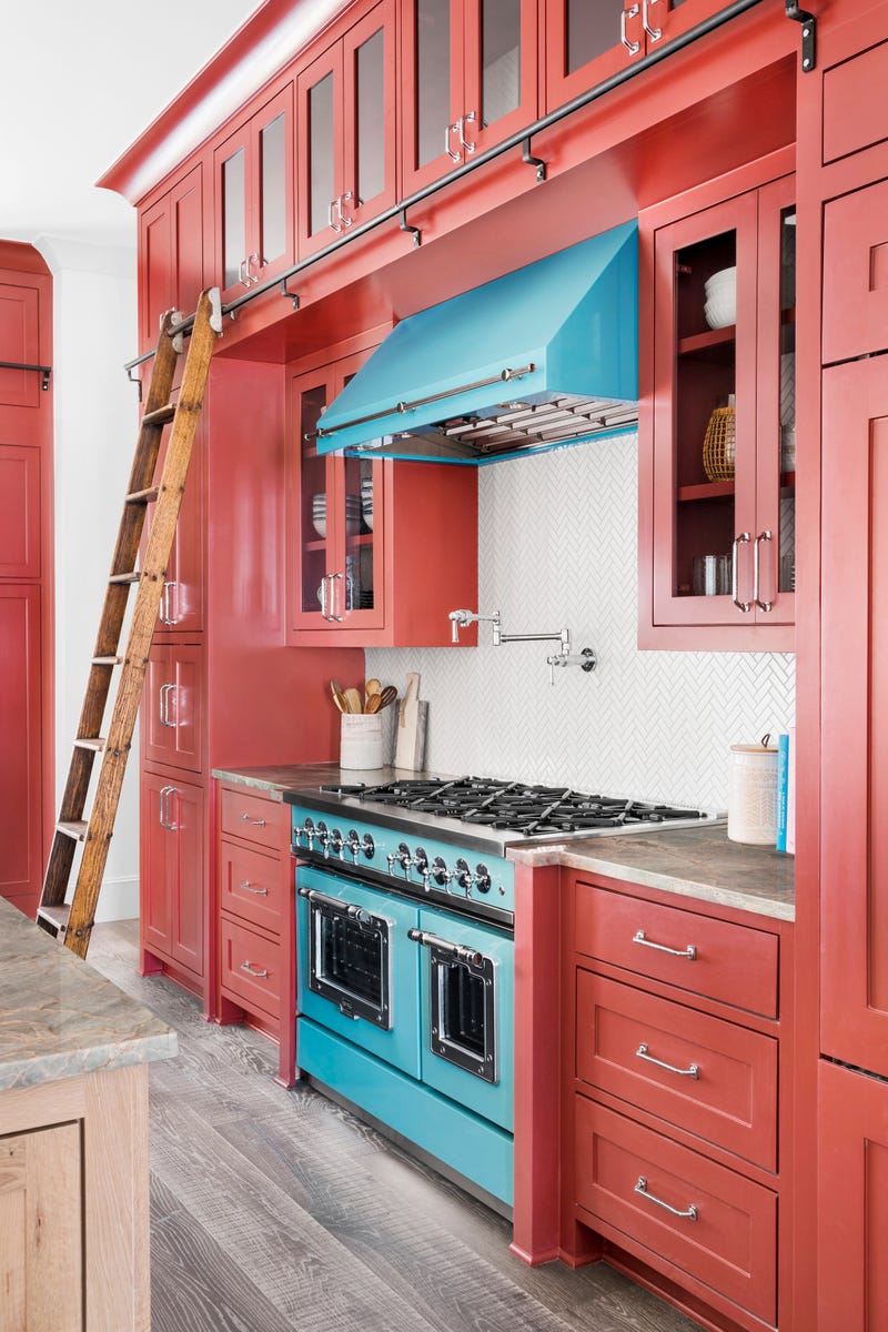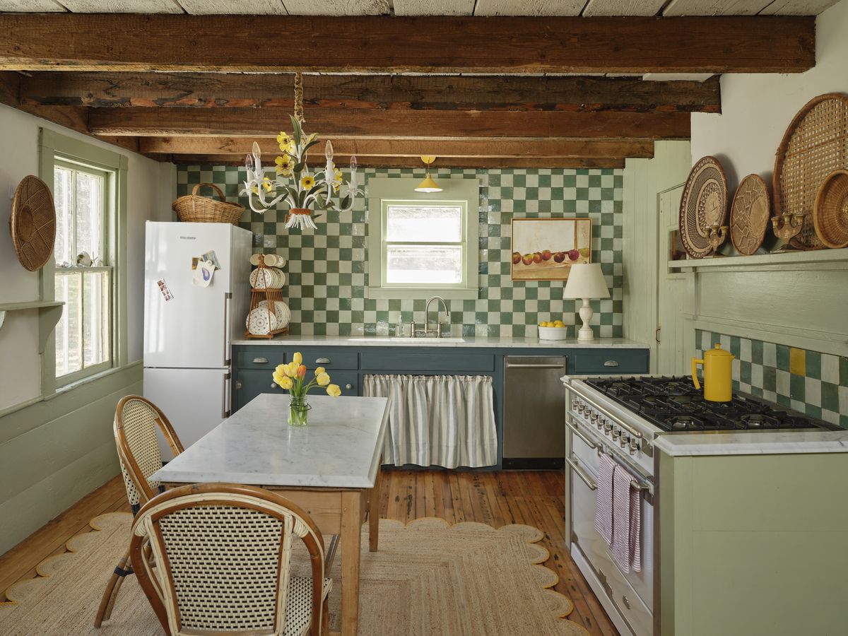 Grace Mitchell’s lively kitchen features small tiles configured in a timeless herringbone pattern, paired with colored cabinetry.