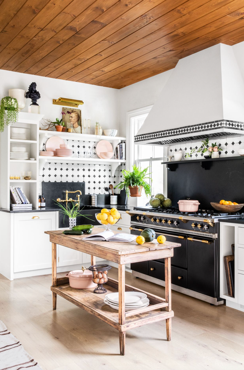 Grace Mitchell used creatively arranged black-and-white hex tiles to add historic character to her kitchen, pairing them with vintage finds.