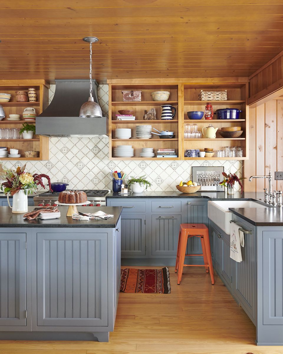 This family-friendly cabin features beadboard-fronted cabinets, soapstone countertops, and handmade terra-cotta tiles set on the diagonal, creating a vintage cottage vibe.