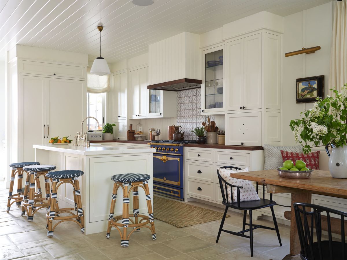 Encaustic tiles create a fun focal point in this kitchen, complemented by a cool blue island and tractor-seat barstools.