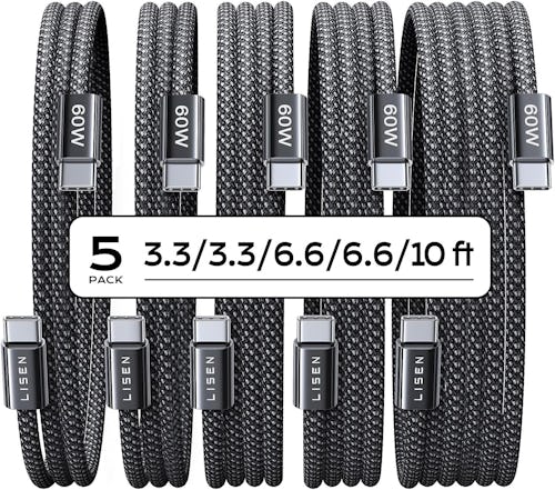LISEN USB-C Cable (5-Pack) offers a variety of lengths and is super durable. With a USB-C to USB-C design, they’re great for Androids and newer iPhone models. They charge devices quickly, making them a practical and budget-friendly staple.