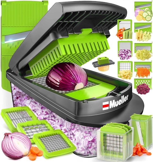 Another great deal is the Mueller Pro-Series 10-in-1 Vegetable Chopper. This high-rated vegetable chopper comes with eight blades that can grate, shred, slice, dice, and chop various foods. It features stainless steel blades and a seven-cup chamber for efficient food preparation. No knives or cutting boards are needed, making it an excellent tool for anyone looking to streamline their kitchen tasks.