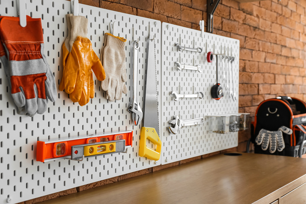 Pegboards aren’t just for garages. In kitchens, they hold pots, pans, and utensils; in home offices, they organize supplies and cables. Their flexibility allows you to change hooks and shelves as needs evolve. A four-by-eight-foot pegboard provides 32 square feet of customizable storage. You can paint them to match your walls or choose contrasting colors. Hardware stores sell hundreds of different hooks and baskets for pegboard systems, and changing the layout takes minutes.