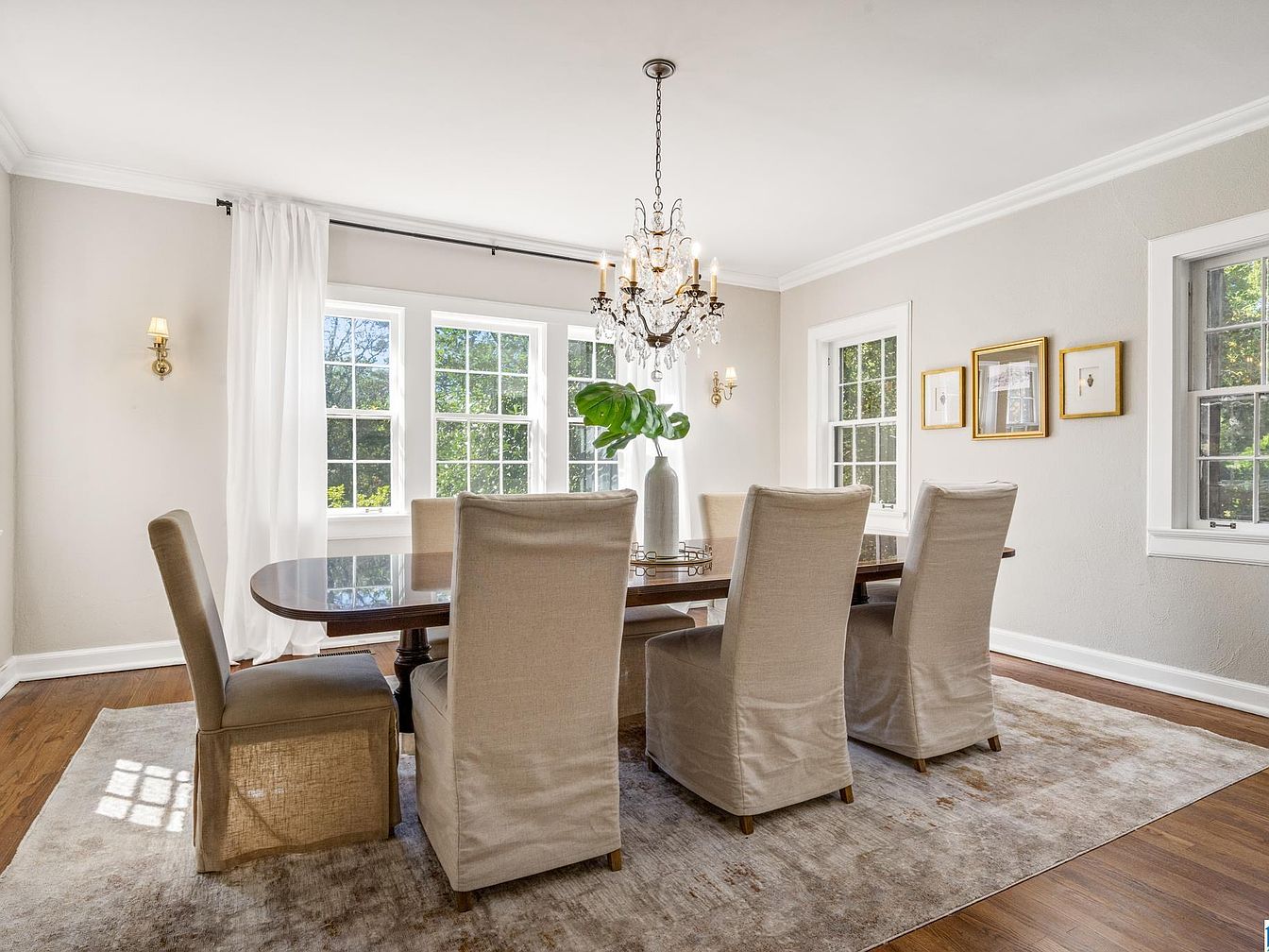 A spacious dining room featuring a long, dark wooden table surrounded by eight high-backed, cream-colored upholstered chairs, each with neatly tailored slipcovers. Three large windows and one smaller one allow abundant natural light to fill the room, accented by sheer white curtains. The walls are painted a soft beige with crisp white trim and crown molding, contributing to a serene, classic ambiance. A sparkling crystal chandelier hangs above the table as a focal point, accompanied by two graceful wall sconces. An area rug in muted tones grounds the space, while framed botanical prints add a touch of refined elegance to one wall.