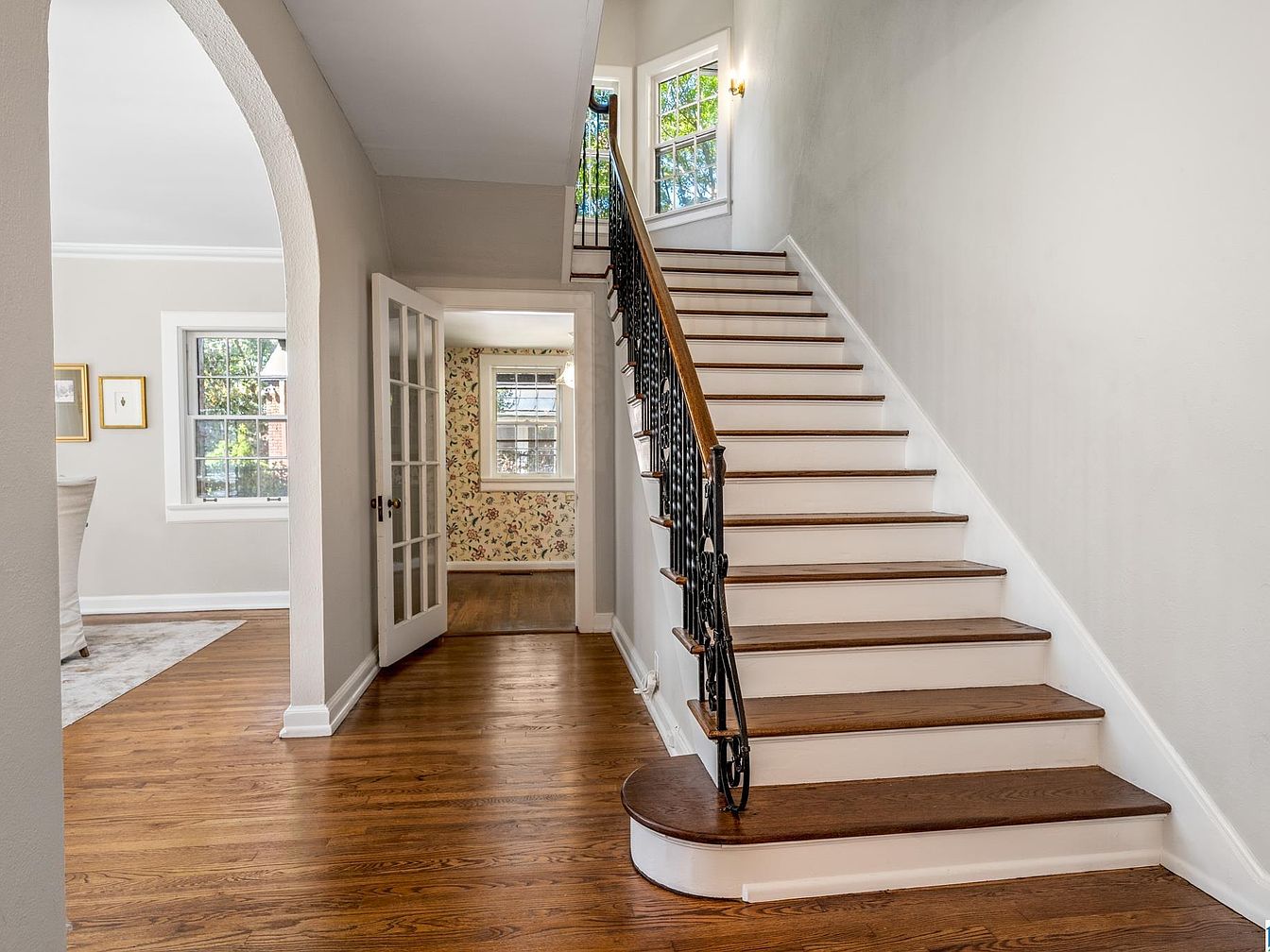 Grand hardwood stairs with white risers ascend to the second floor, featuring a dark wooden banister paired with elegant black wrought iron railing. The entry hallway has beautifully polished wooden floors and pale walls, creating an airy, welcoming atmosphere. To one side, an open arched doorway leads into an adjacent light-filled living area, while another doorway with glass-paneled French doors opens into a room with floral-patterned wallpaper. Large windows throughout the space invite natural light, highlighting the clean architectural lines and classic, timeless aesthetic that emphasizes warmth and historical charm.