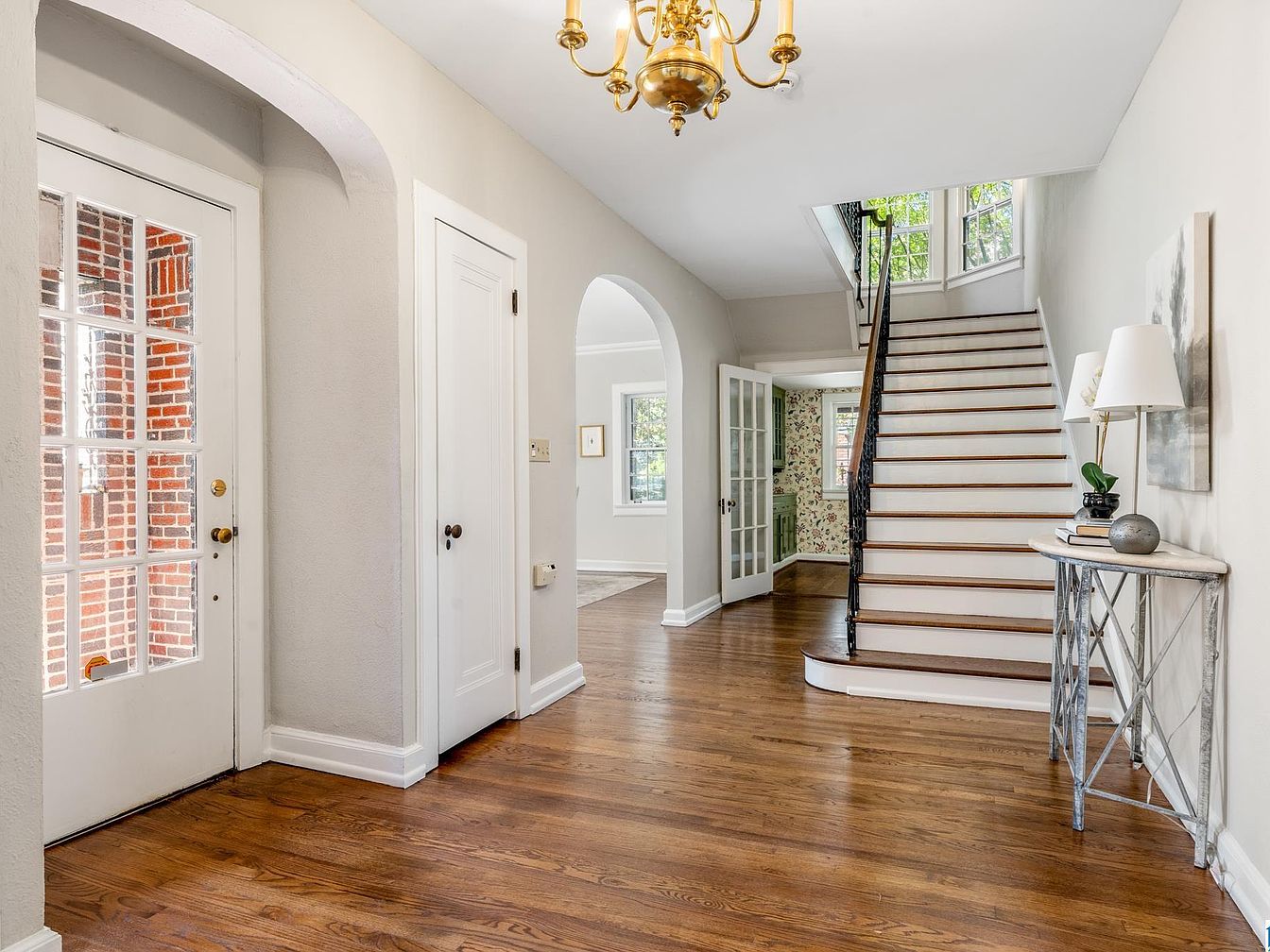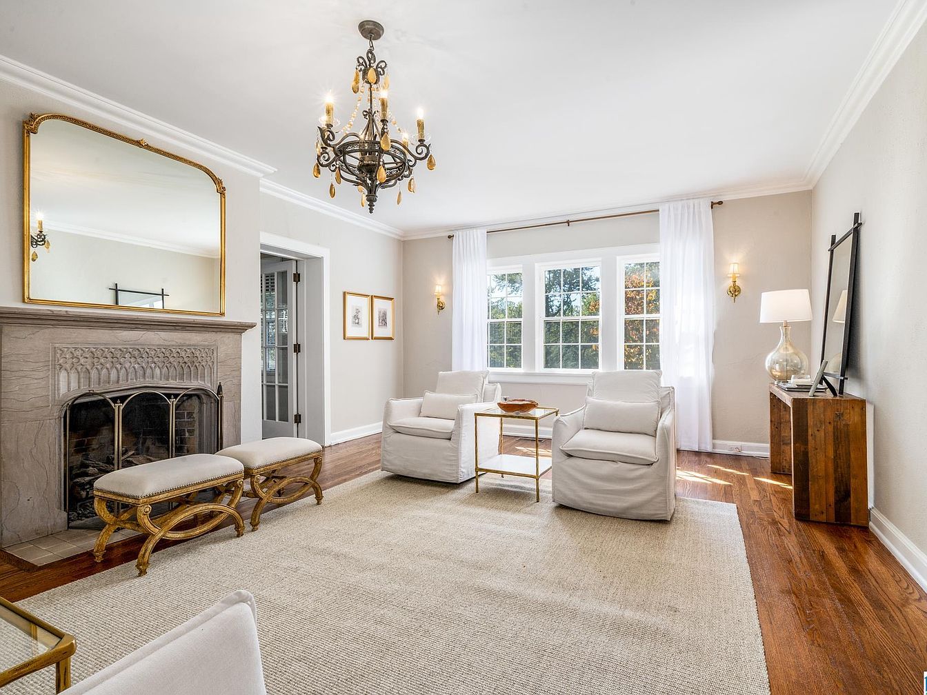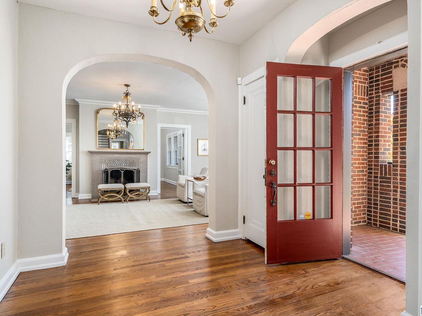 Warm hardwood floors lead from a bright entryway, where a red-paned wooden door opens to an enclosed brick porch area. Ahead, a stately archway frames the living room, showcasing classic architectural lines and soft beige walls. A traditional fireplace with a light stone mantle sits beneath an ornate gold-framed mirror, complemented by a grand chandelier. Two small upholstered benches rest before the hearth, while elegant white armchairs and a light rug soften the space. Subtle white crown molding, wide doorways, and abundant natural light enhance the historic and welcoming ambiance of this home’s entrance and living area.