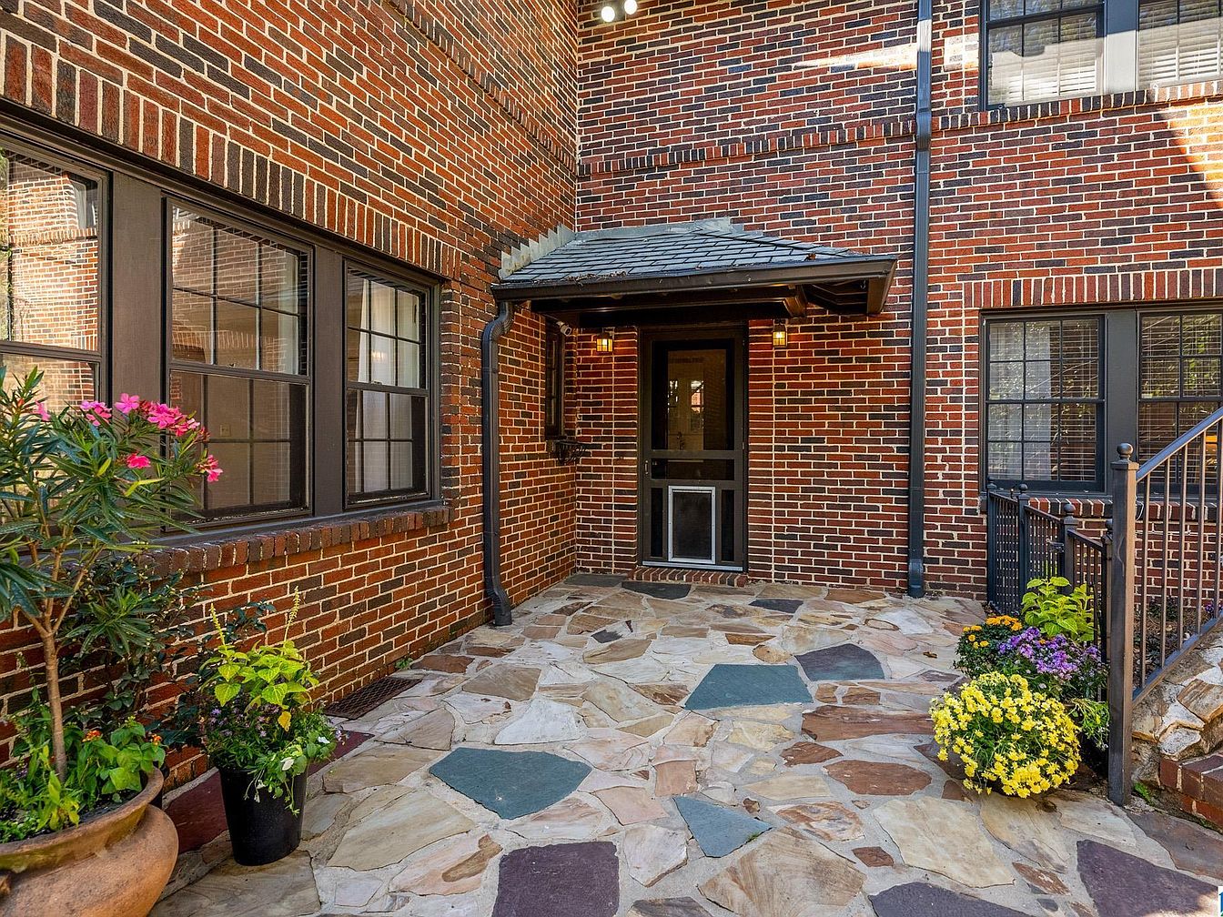 A charming brick exterior courtyard featuring a small covered entrance door framed in dark wood, likely leading to a side or back entrance of the home. The ground is paved with large, irregular flagstones in earthy tones of tan, brown, and hints of slate blue. Raised iron railing and steps suggest a gentle change in elevation. Tall windows with black trim line the walls, reflecting natural light. The space is adorned with flourishing potted plants and vibrant flowers—yellows, pinks, and greens—adding color and a welcoming appeal against the deep red and brown tones of the historic brick façade.