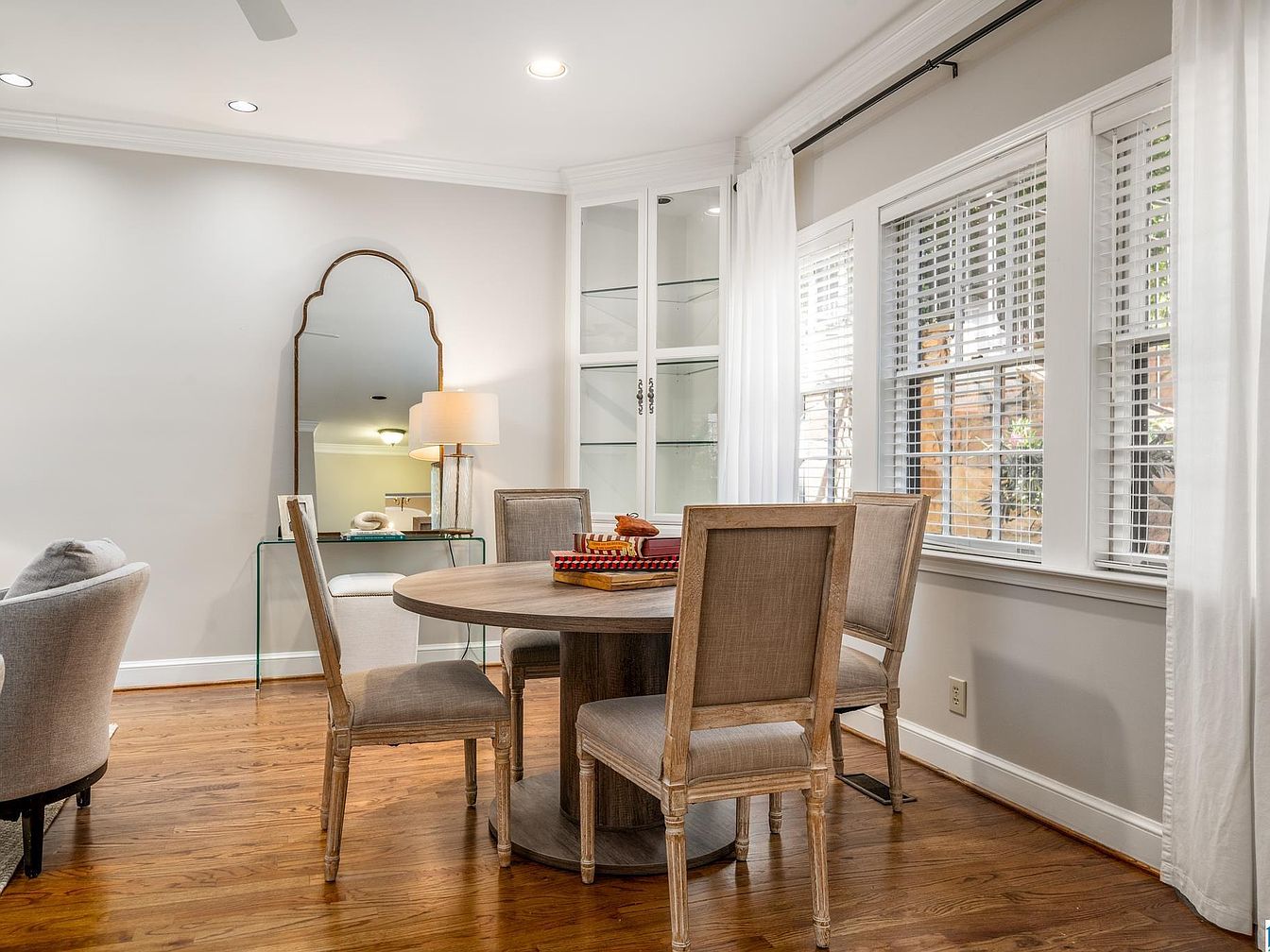 A cozy dining nook features a round wooden table surrounded by four light beige upholstered chairs with a rustic finish. Natural light pours in through three large windows with white blinds, framed by sheer white curtains, giving the space an airy and inviting feel. The walls are painted a soft neutral gray, and the polished hardwood flooring adds warmth. In the corner, a built-in glass-fronted cabinet holds decorative items. An elegant arched mirror and a slim console table with a modern lamp sit against one wall, adding both depth and sophistication to this charming eating area.