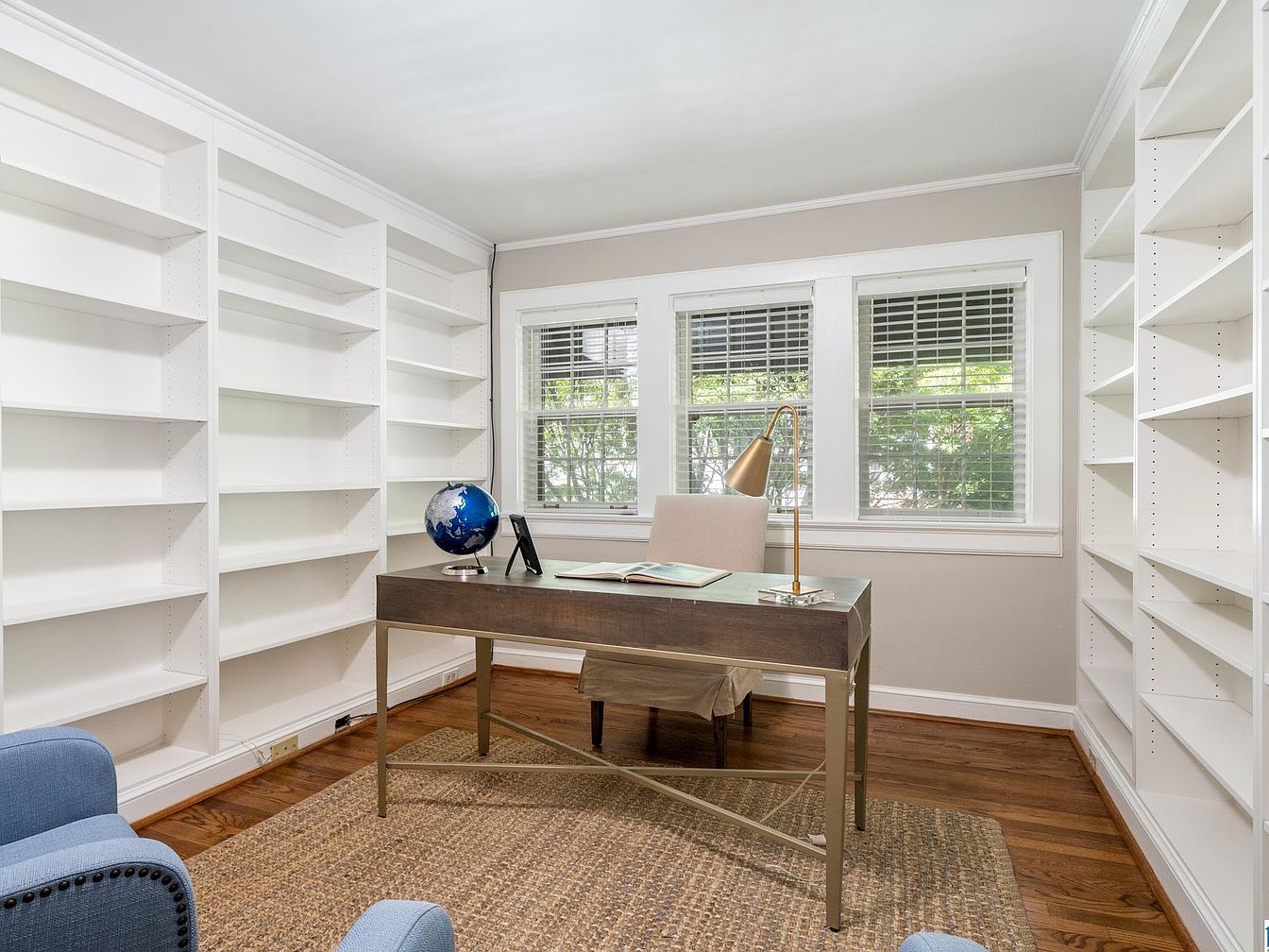 A bright, airy home office with large windows framed by white trim allows natural light to flood the space. The room features built-in white bookshelves covering two entire walls, offering ample storage and display space. At the center, a modern wooden desk with metal legs sits atop a woven rug, paired with a light beige upholstered chair. A gold desk lamp, a decorative globe, and a tablet rest on the desk, contributing subtle sophistication. The hardwood floors add warmth, while soft neutral wall colors keep the space calm and inviting. Blue armchairs in the foreground provide additional seating.