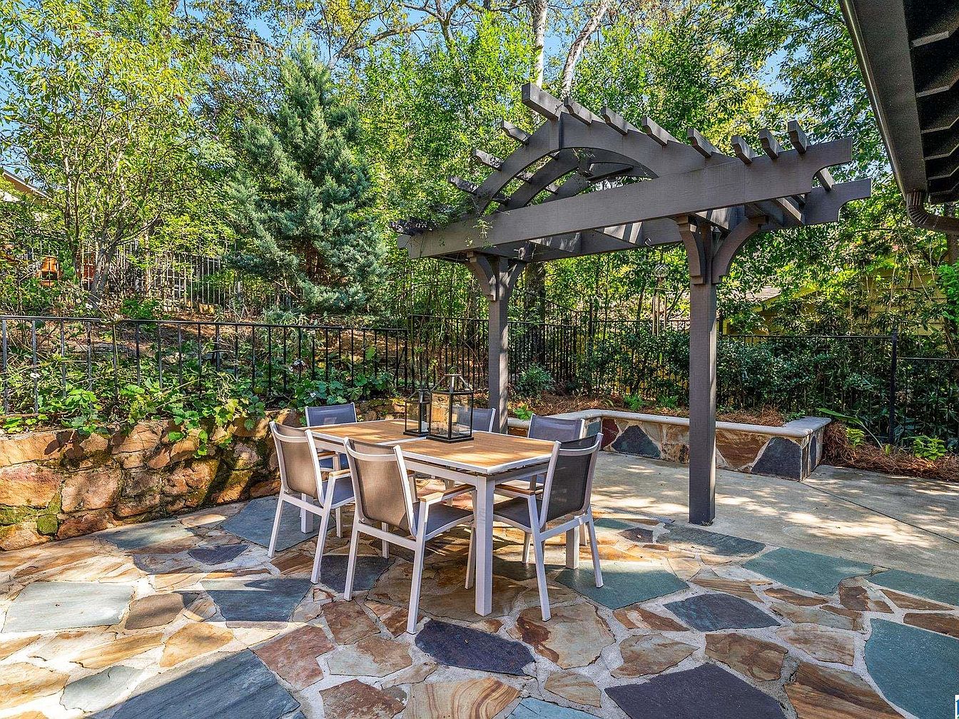 A spacious stone patio sits alongside a historic brick home, with a classic red and dark brown brick exterior. The patio flooring features irregularly shaped flagstones in neutral beige and gray hues. Black iron railings create a sense of enclosure, while potted plants and flowers add natural color and charm. Beyond the main area, a charming wooden pergola provides shade over a white rectangular dining table surrounded by white outdoor chairs. Lush greenery and mature trees offer a private, tranquil atmosphere, filtered with sunlight and framed by rustic yet inviting landscaping elements.