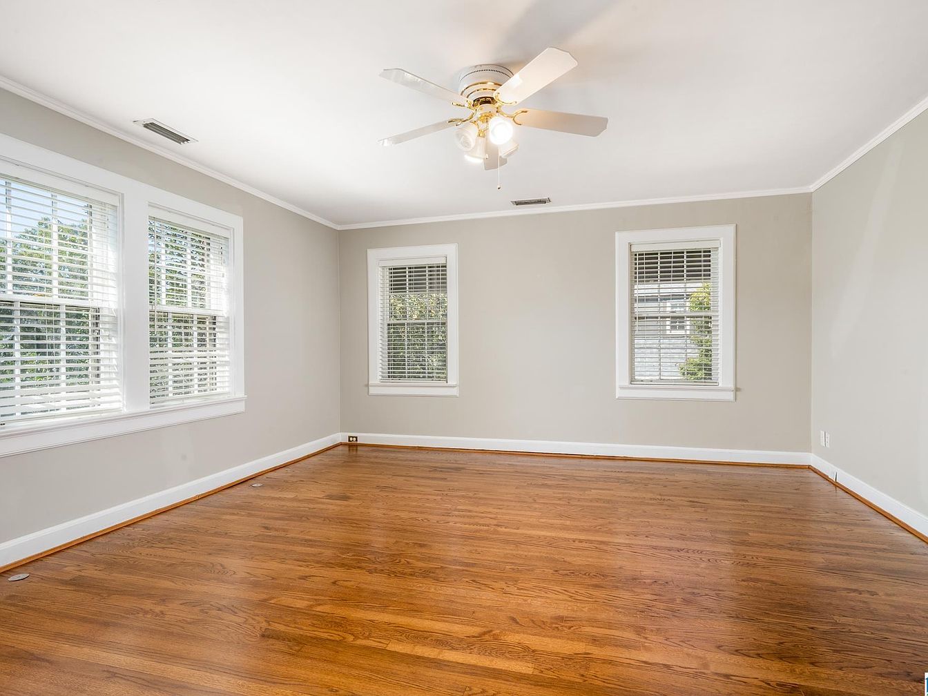 A spacious, sunlit room with polished medium-toned hardwood floors stretches wall to wall, bordered by crisp white baseboards. Light gray walls provide a subtle, calming backdrop, complemented by large double-hung windows with white wood trim and matching blinds, allowing plenty of natural light to pour in. The ceiling is smooth and white, featuring a central, white ceiling fan with brass highlights and a trio of lights. Simple crown molding encircles the room for a refined finish. The space feels airy, open, and clean, offering an attractive blank canvas for various furniture arrangements and styles.