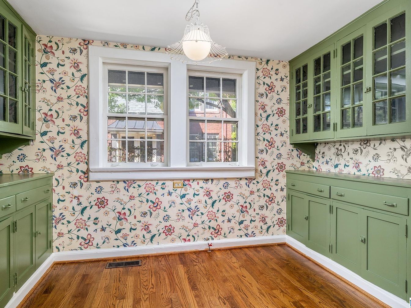 A bright room featuring large double windows framed with white trim, allowing natural light to flow in. Built-in cabinetry painted sage green lines two adjacent walls, with upper cabinets featuring glass-paneled doors and lower cabinets providing ample closed storage. The walls are covered in cream-colored wallpaper adorned with lively floral patterns in pastel shades of pink, green, blue, and red, giving the space a cheerful, vintage charm. The honey-toned, glossy hardwood floor adds warmth and contrasts gently with the green cabinetry. Overhead, a white ruffled pendant light hangs, enhancing the room’s inviting and nostalgic style.