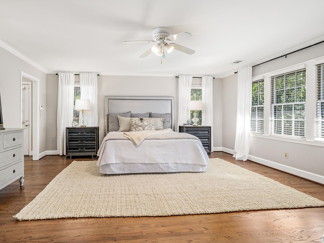 A spacious bedroom with a minimalist, airy design. Soft gray walls and white trim create a calm atmosphere, complemented by wide-plank hardwood floors. The bed, centered on a large, textured cream rug, features a plush, tufted headboard in gray, dressed in layered white and neutral linens with decorative throw pillows. Matching dark wood nightstands flank the bed, each topped with a classic table lamp and decorative accents. Wide, double-hung windows with white blinds line the wall to the right, allowing natural light to fill the room, amplified by sheer white curtains. A white ceiling fan adds comfort and a gentle touch.