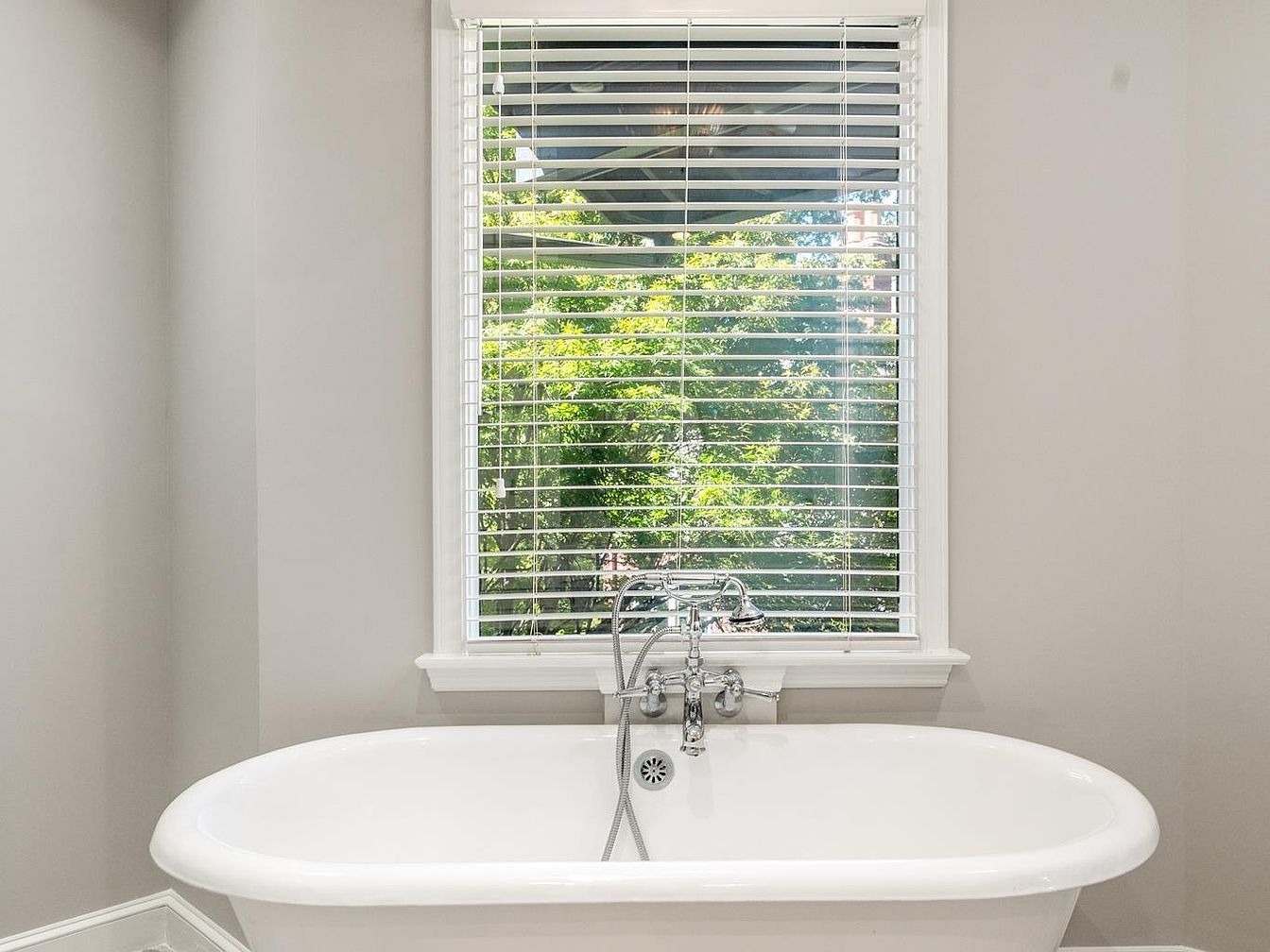 A classic white freestanding soaking tub stands centered under a large window, which lets in abundant natural light. The window has white horizontal blinds offering privacy while still showcasing green trees and a glimpse of a garden outside. Soft gray walls and crisp white trim create a calm, modern yet timeless backdrop. The bathtub features polished chrome fixtures, adding a touch of elegance and vintage appeal. The overall aesthetic is clean, airy, and serene, pairing minimalistic design with subtle luxury. The layout focuses on relaxation while framing a view of the outdoors for a peaceful bathing experience.
