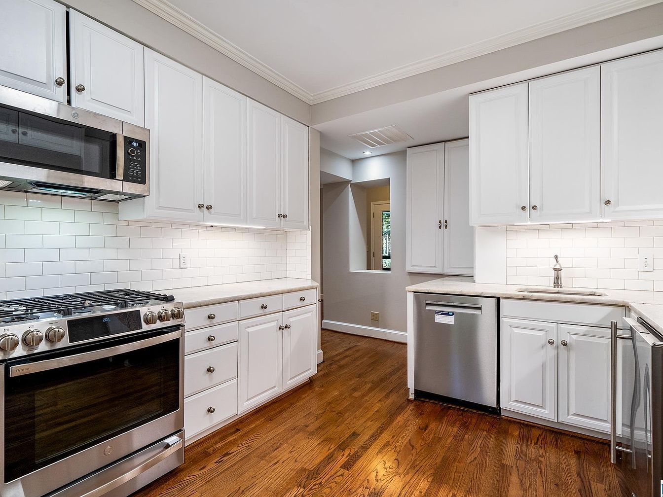 A modern kitchen with a clean and inviting ambiance, featuring white cabinetry with brushed metal knobs and handles that provide a crisp, fresh look against a neutral color palette. The countertops are a light stone, complementing the white subway tile backsplash that adds texture and classic charm. Stainless steel appliances, including a gas range with an overhead microwave and a dishwasher, bring a contemporary feel. The floors are finished in a rich medium-toned hardwood, warming the space and contrasting elegantly with the white cabinets. Recessed lighting and under-cabinet lights enhance the room’s brightness and functionality.
