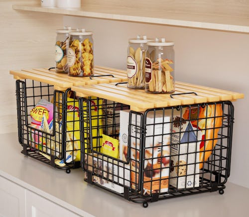 GGIU Stackable Wire Storage Baskets (2-Pack) are versatile and perfect for storing produce, snacks, or pet toys. The bamboo lids allow for stacking or can be used as shelves for added storage.