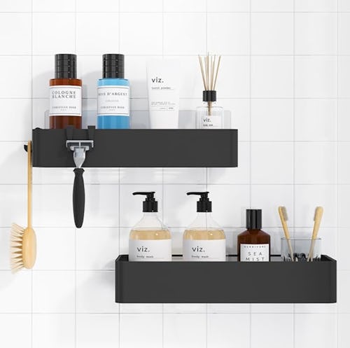 Kitsure Large Shower Caddy (Set of 2) mounts to the wall or inside the shower and can hold up to 12 pounds of supplies. It has wire bottoms for easy draining.