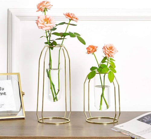 NUPTIO Flower Vase Terrarium Planters (2-Pack) are a unique and eye-catching way to display bouquets. They feature transparent glass tubes suspended from golden wire frames.