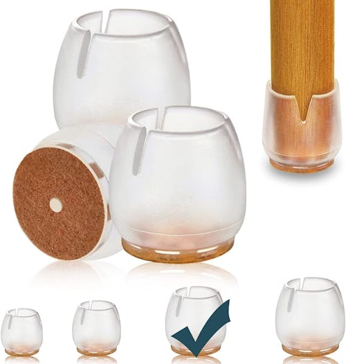 godehone Chair Leg Protectors (32 Pieces) stretch to fit around the bottoms of your couch, table, or chair legs to prevent scratches. They also help prevent loud screeching sounds when moving chairs.