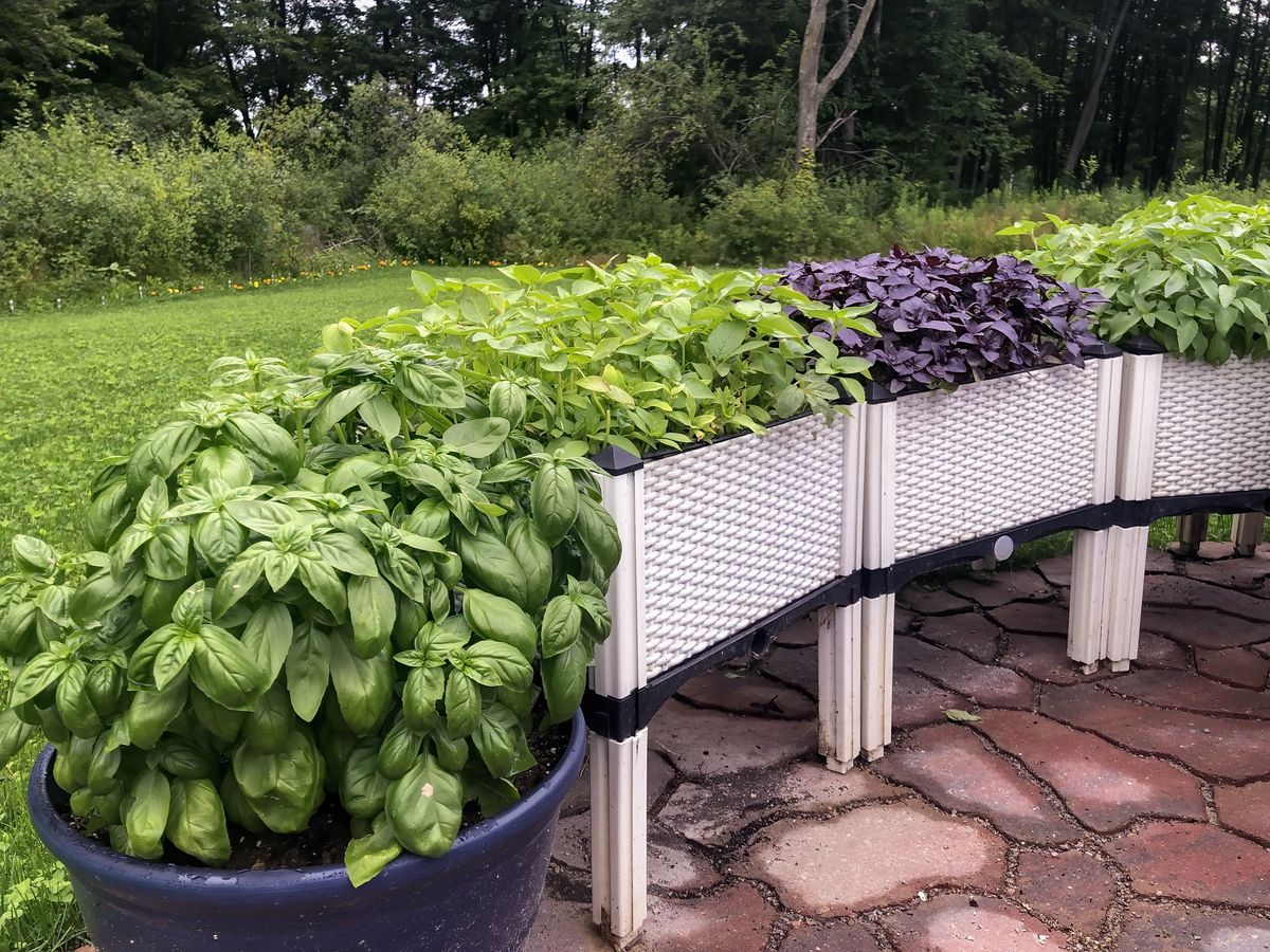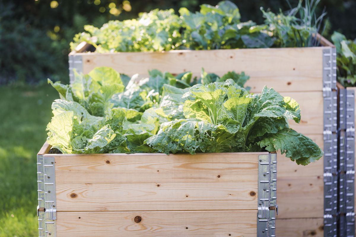Raised bed planters make gardening chores so much easier! Here, edible greens are elevated, making weeding and harvesting much easier on the back.