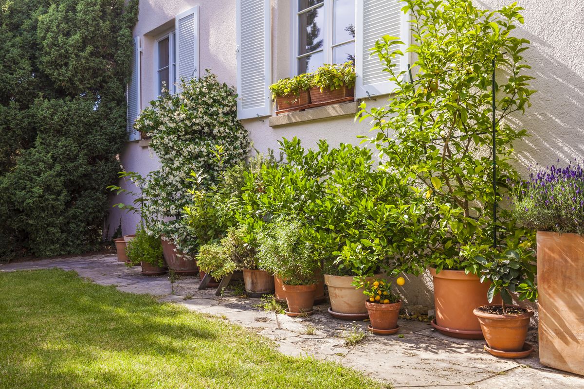 Transport yourself to the Mediterranean by growing a citrus tree in a container on your sunny patio. Many types of citrus trees, such as calamondin, stay petite, so you can bring them indoors in the cold weather months.