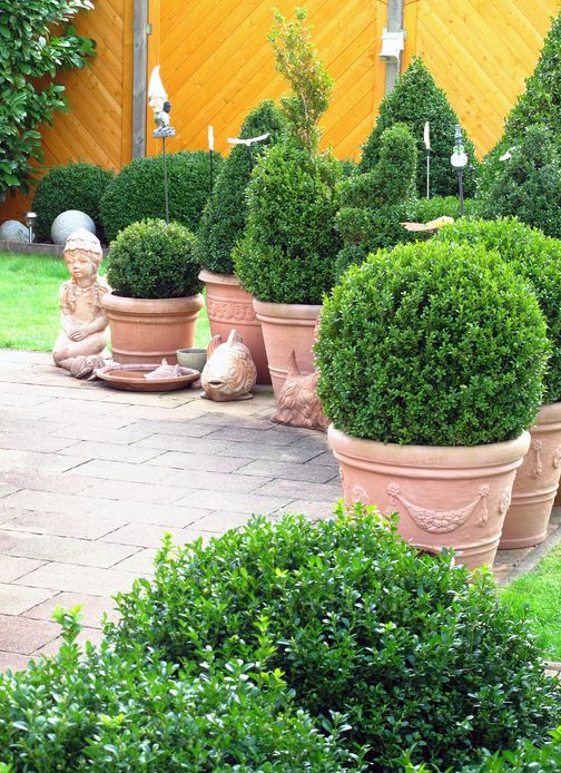 Create an English garden vibe by planting boxwood shrubs in containers and setting them around the edges of your deck or patio. Voila: You have a “moveable” hedge.