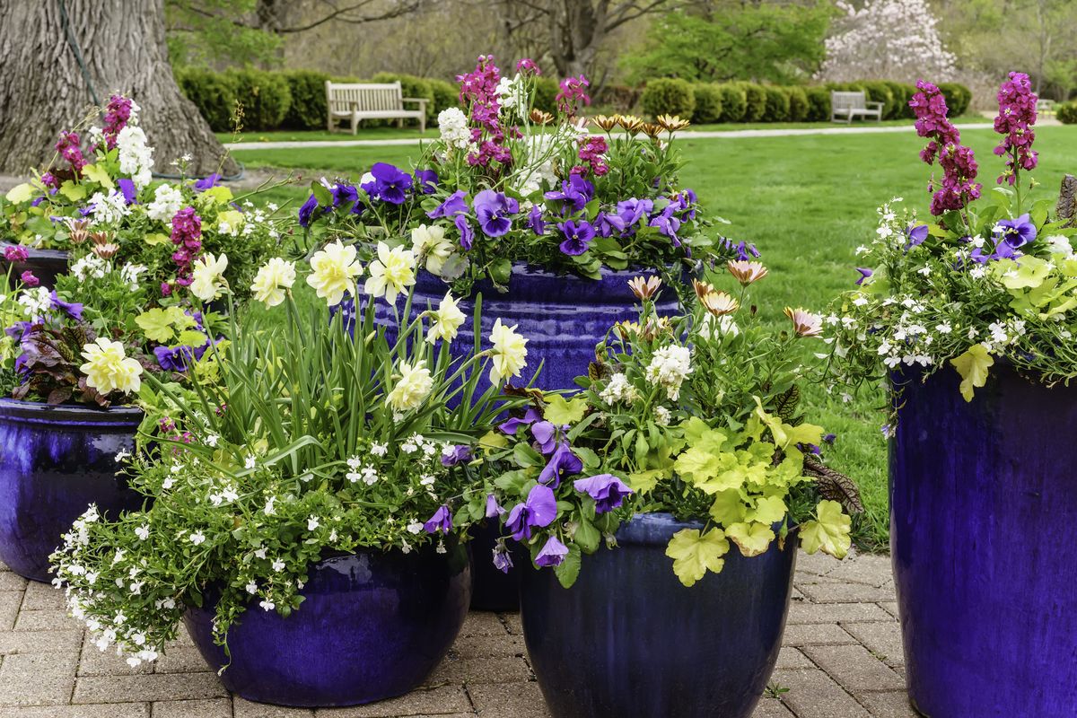 When decorating a space, try to vary heights of pots. You can place larger pots next to smaller ones, or raise a pot by stacking it on top of an extra upside-down pot. Here, an early spring garden glows with cool-season favorites such as lobelia.