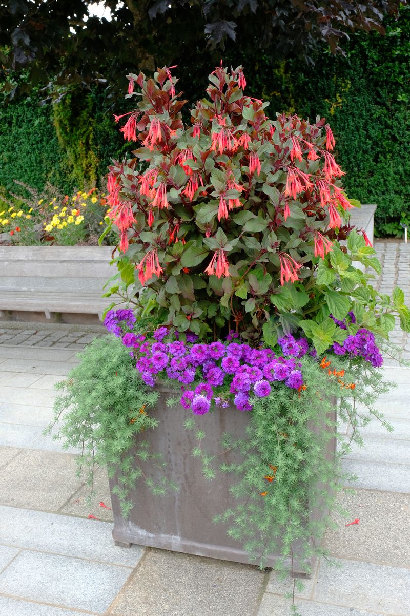 This stunning combination pot perfectly illustrates the concept of spiller, thriller, filler when building a container. The coral begonias are especially striking in contrast to the purple lantana, while sedum spills over the edges of the pot.