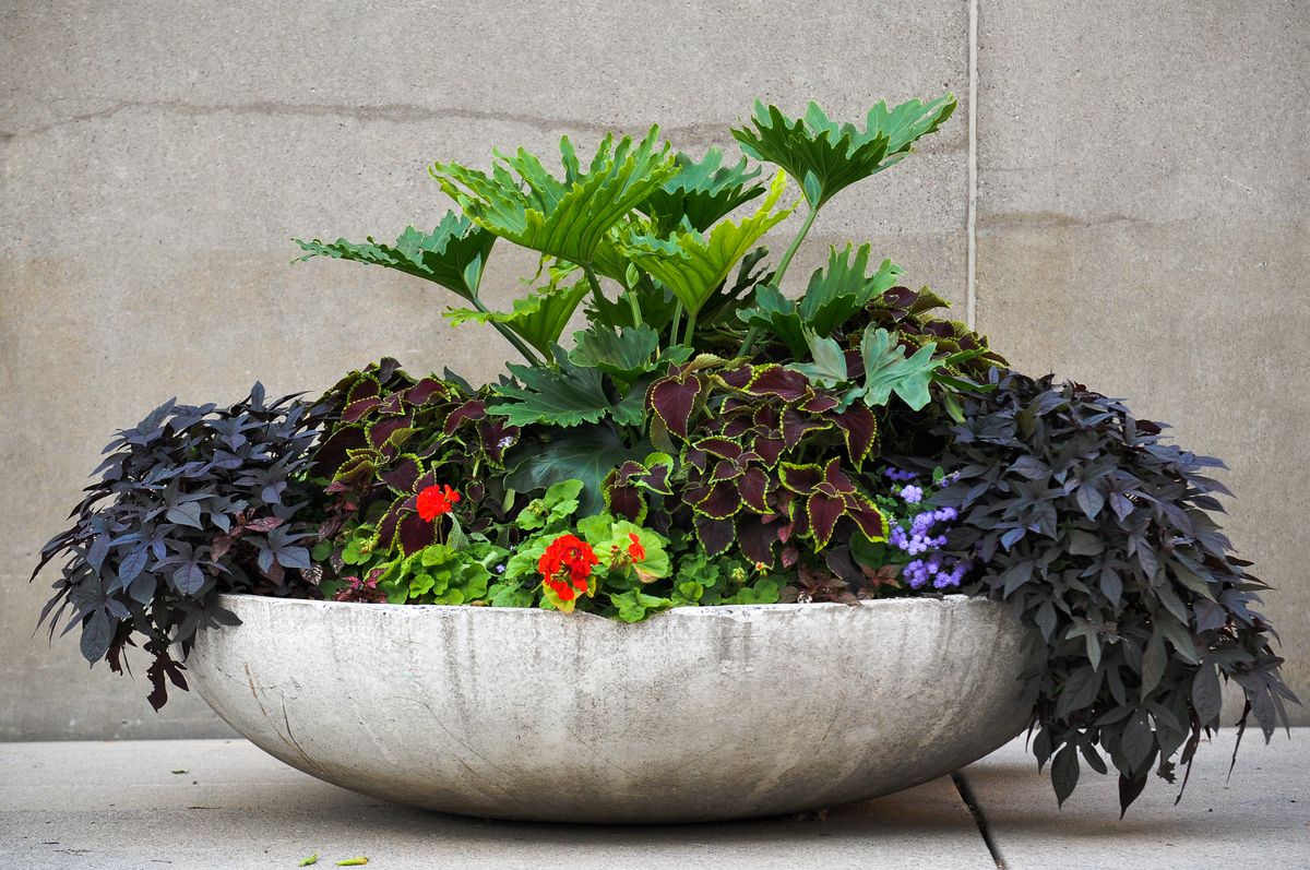 A modern planter is accented with a philodendron in the center, surrounded by colorful annuals such as coleus, floss flower, and geraniums. This unexpected combination pops against the grey concrete.