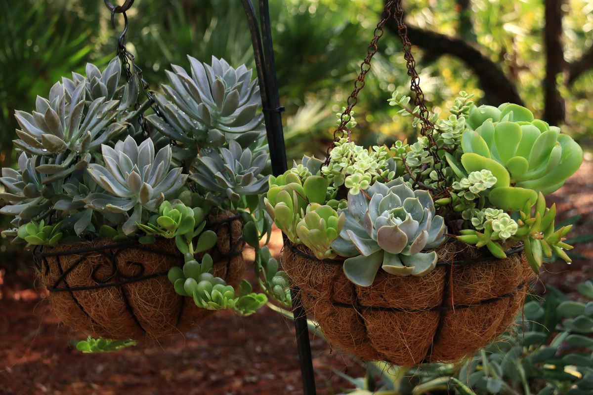 Succulents come an array of shapes and colors. Here, they’re arranged in a hanging basket for an especially charming presentation.