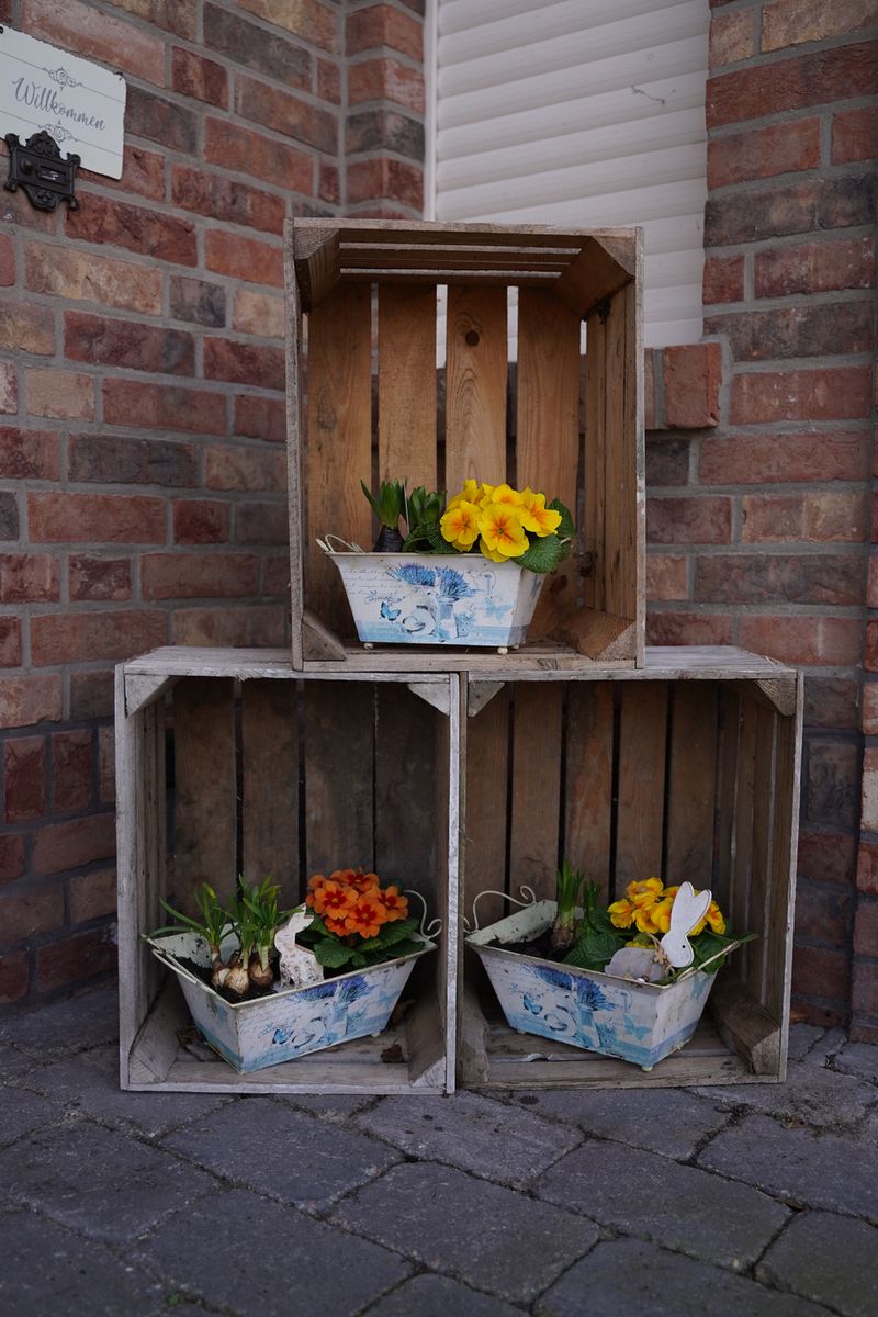 Fill an empty corner of your deck or entryway with a display of wooden crates filled with tiny planters. Change it out every season: Petunias for summer, mums for fall, and greens tucked into buckets for winter.