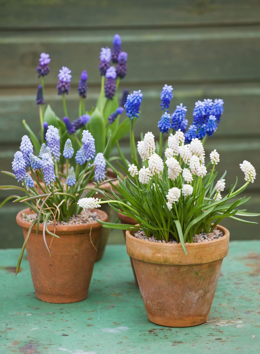 Who says you need big pots to make an impact? Three petite pots of grape hyacinth add springtime charm to a deck or front porch.