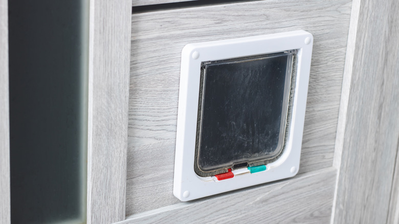 One option is a high-tech door that uses sensors on your dog's collar to open, but if you're trying to avoid electronics, you can choose a model with manual locks. That way, you can lock the door when you're not home or when you're asleep. When adding a doggy door, avoid installing it into a door. Instead, choose a wall installation that's too far away from the door's locks for someone to reach using the doggy door.