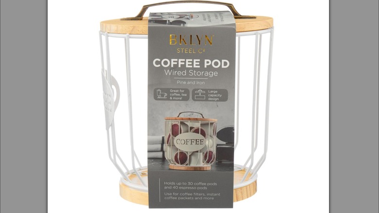 Whether you use a Nespresso machine or a Keurig, finding a spot to store your coffee pods can be a tad annoying. If you're looking for something that's aesthetically pleasing and also holds a large amount of coffee pods, pOpshelf has a wired coffee pod storage container that costs $10. It has a light wood base and top, and the body of the container is made from white wires that connect from the two wooden ends. It almost resembles a bird cage, and is definitely easy on the eye. On one side, there is an iron oval that has the word "coffee" cut into it. Lastly, a dark gold handle on the top adds a bit more style as well as practicality.