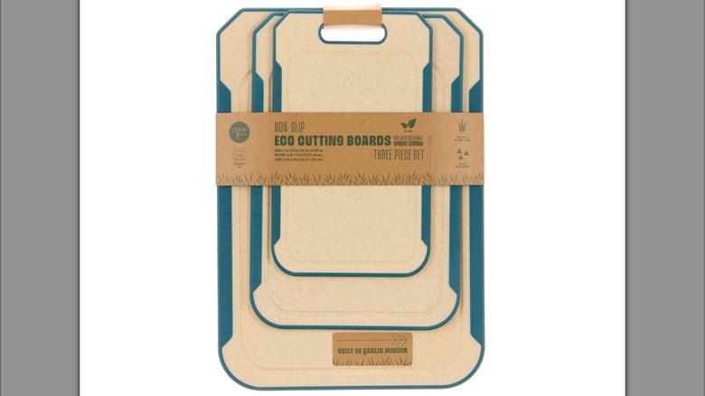 This cutting board stands out amongst others mainly because of the non-slip feature. This allows you to dice, slice, and cut your food freely without worrying about the board sliding around your countertop. There is also a small handle at the top of each board, which makes picking up the boards and cleaning them a breeze. The large board even has a built-in garlic mincer, taking away the need for a completely separate kitchen tool. Lastly, these are dishwasher safe, so just throw them into your dishwasher when you're done — you won't have to worry about the cleanup.