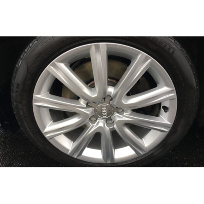 Apply a cleaner that is appropriate for the type of wheels you have, whether they are chrome, painted or anodized. You’ll probably want to use a cleaner that works on both tires and rims to save time and money. Rinse clean, then dry so they look beautiful again, like the wheel shown here.