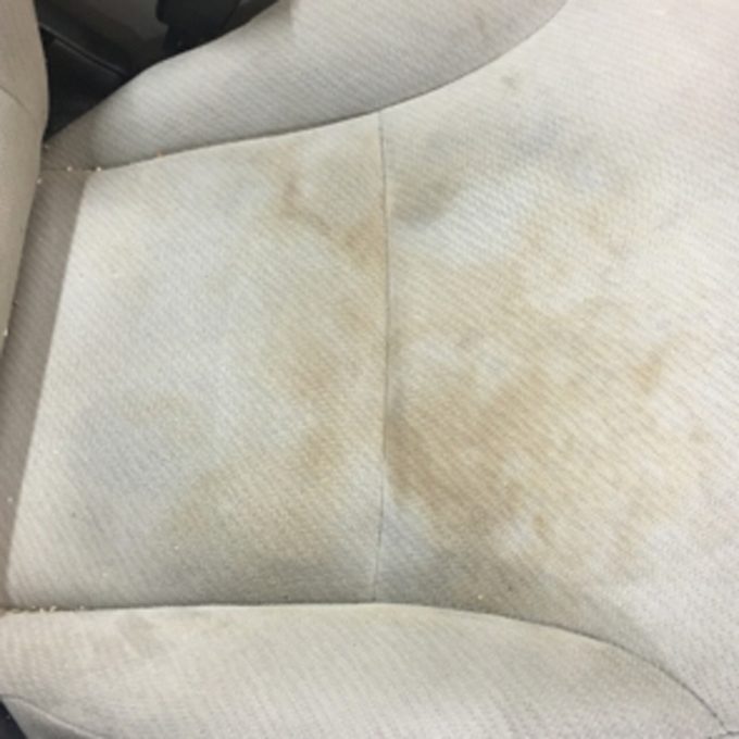 Many of us say that we aren’t going to allow eating or drinking in our car when we first get it. But, who are we kidding? That never happens, so spills and seat messes are inevitable. Car detailing before and after photos often show how seats can be cleaned to look as if they were never dirty in the first place. This seat mess looks like it could be a spilled cup of coffee or cola.