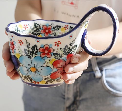 Heat and enjoy everything from soup to oatmeal in this 18-ounce loop handle mug. The oversized glazed mug is made of microwave and dishwasher-safe ceramic that features a beautiful glaze and a stunning painted floral pattern. Shoppers say the loop handle is one of their favorite features, providing a safe and comfortable grip even when the contents of the mug are steaming hot.