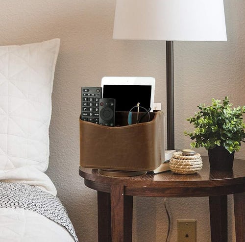 If you’re always looking for the TV remote, this spinning remote control holder provides a designated home for it. The organizer has an elegant faux leather exterior, and its interior is divided into five individual compartments to keep items upright and neatly organized. The bottom rotates 360 degrees for easy access.